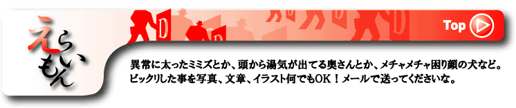 ●いやあ〜世の中にはオモロイ事やってる人がいますね―。 カナリ笑えます。「笑い」は芸術なんですよ、 やっぱり、「アホ」と「天才」のギリギリの部分が「オモロイ」んですね。 この画像は ある所 で見ることが出来ます。 もっと笑える作品がたくさん有りますので、是非行ってみてください。 |