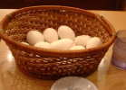 ●「天下一品」のラーメンです。 ま、それはいいんですが・・・写真左は「無料ゆで卵」なんですが いくら無料だ、好物だって、10コも食ってるヤツがいましたよ。 どーでしょうか?4つはラーメンが来る前に、3つはラーメンの中へ、そして最後はデザートにと・・・言った感じでした。 次の朝はもちろん、「イヤ〜な膨満感」でしたよ。オナラも臭い。でも好きなんだよっ! |